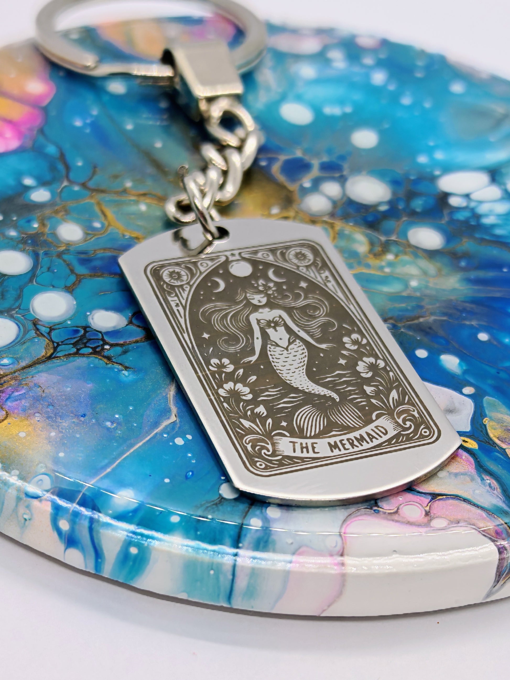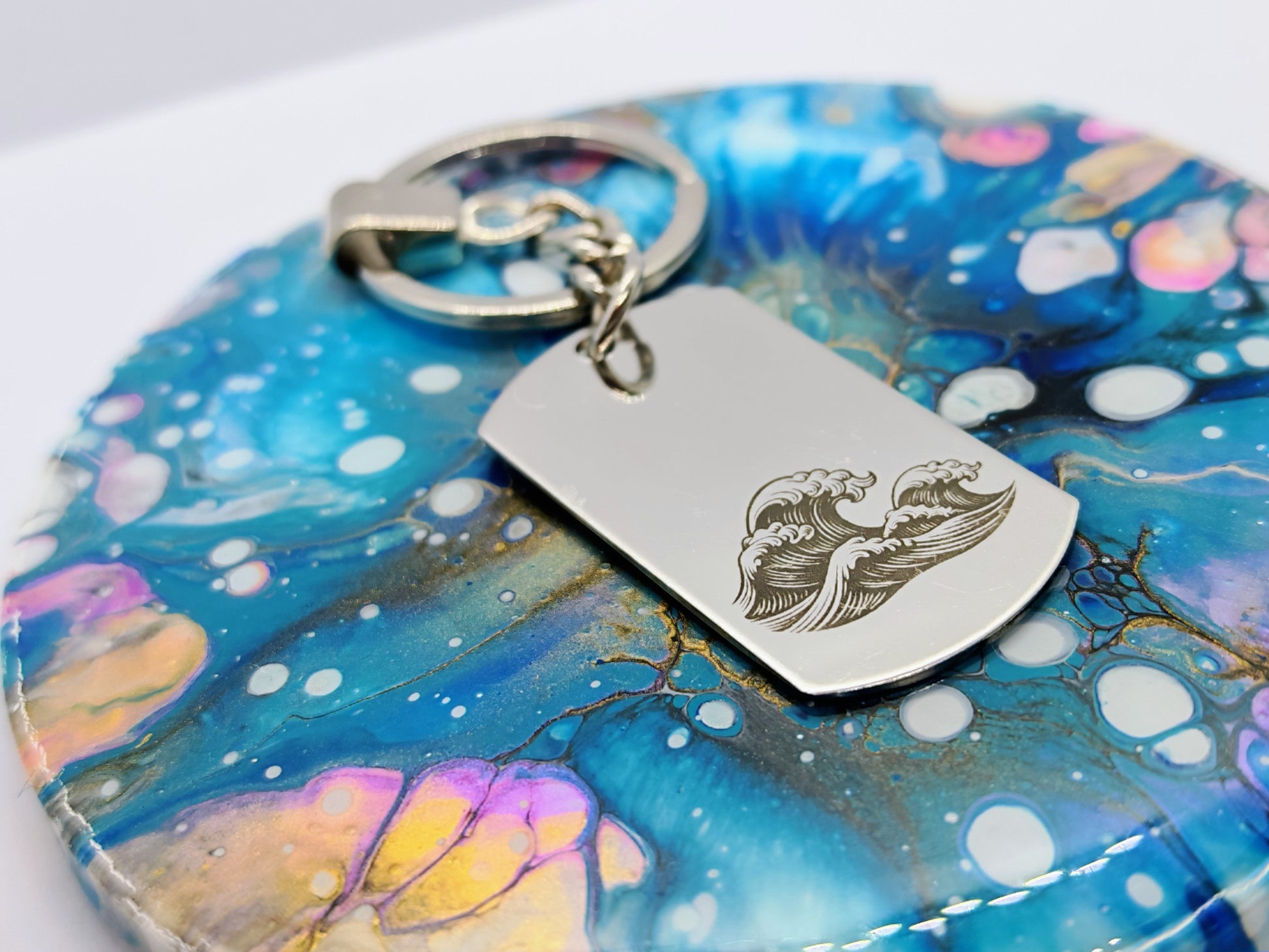 A rectangle stainless steel keyring with a coastal design engraved on. 12 designs to choose from including an anchor, mermaid and waves